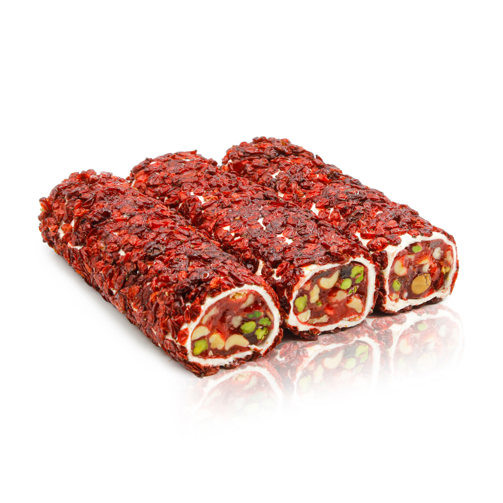 Sugar, Corn Starch, Water, Pistachios (4), Almonds (2%), Hazelnuts (2%), Walnuts (3%), Peanuts (3%), Raisins, Raisins, Flavouring (pomegranate), Soapwort Juice, Food Colouring (E124), Acidity Regulator (Citric Acid E330) are added.