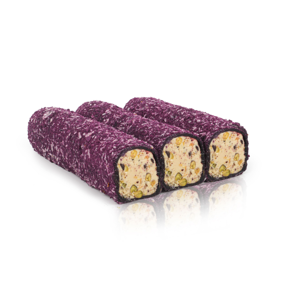 Şeker,Mısır Nişastası,Su,Antep Fıstık(%12),Fındık Kreması[şeker,bitkisel yağ(ayçiçek,palm),Fındık(%10),Peyniraltı Suyu Tozu,Yağsız Süt Tozu,Emülgatör(soya lesitini)],Hindistan Cevizi,Purple velvet cake[Şeker,Buğday unu,süt tozu,buğday nişastası,Emülgatörler(E475,E471,E472b,E477,E472a,E481),